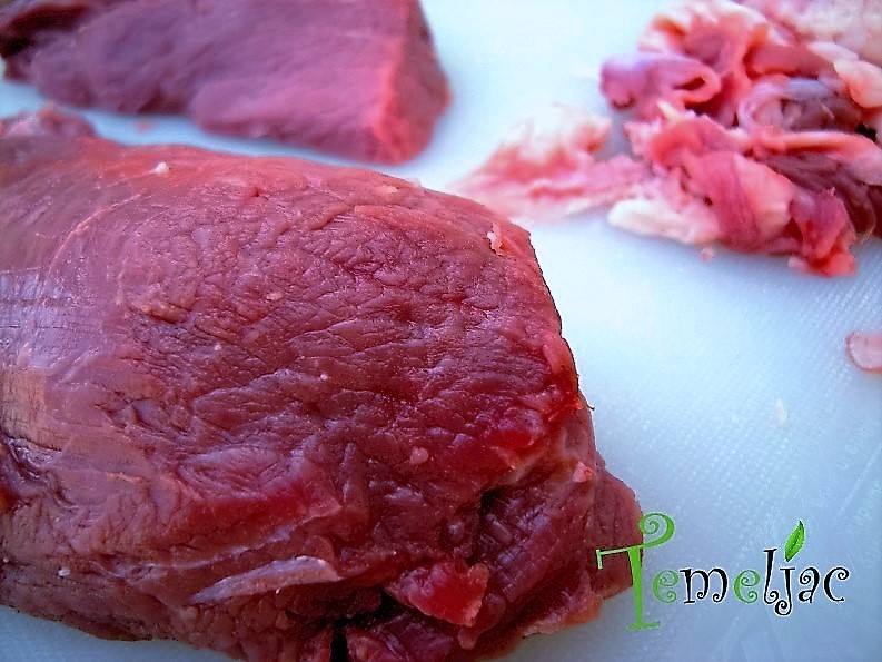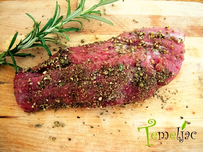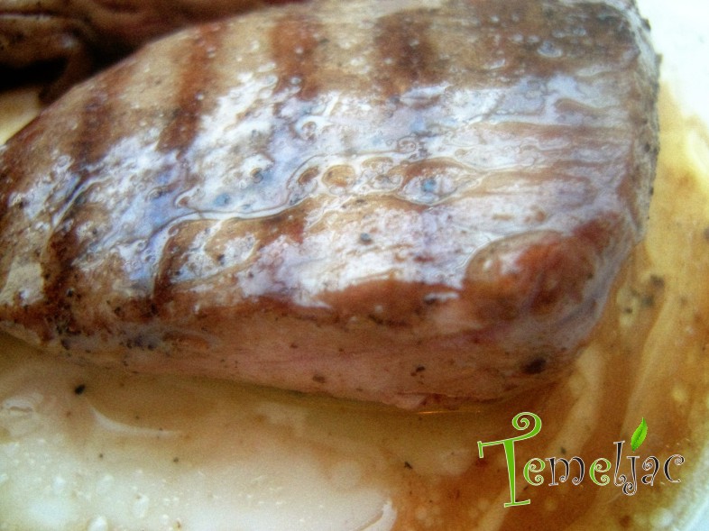 Prvo je potrebno očistiti meso od svih žilica. Za pečenje sam koristila grill tavu koju sam samo ugrijala bez masnoće jer je meso dovoljno ulja upilo ležeći u pacu. Roštilj na drveni ugljen bi bilo najbolje rješenje, ali uvjeti nisu uvijek idealni, pa će i grill tava poslužiti svrsi. Meso sam posolila netom prije pečenja, a može se soliti i nakon. Jedan komad sam uvaljala u zeleni papar usitnjen u mužaru. Inače je zeleni papar divan začin, blaži od crnog papra i od njega i vrhnja se može pripremiti izuzetno fin umak koji paše uz biftek, a i druga mesa, npr. lungić.