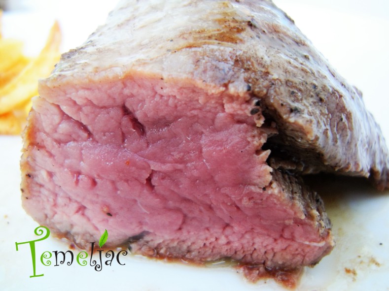 Tavu ugrijte jače, ali ne prejako, otprilike na 2/3 snage i pecite onoliko dugo ovisno o tome kakvo meso želite. Rare ili “sirovi” biftek je vrlo brzo gotov, izvana se kratko zapeče, a iznutra ostaje roza boje i pun sokova, lagano ugrijan. Srednje pečen ili midium se ipak i iznutra termički obradi, ali je i dalje rozi iznutra, dok se well done ili dobro pečen obrađuje dok iznutra ne izgubi rozu boju. Postoje podstupnjevi ove glavne tri podjele, ali o tome u nekom drugom postu. Dok se meso peklo mazala sam ga grančicom ružmarina umočenom u ulje.