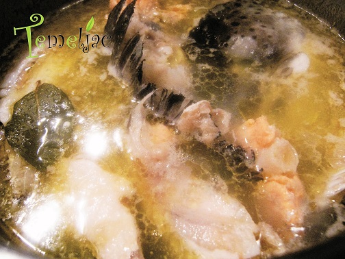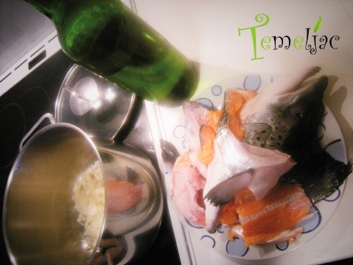 Nasjeckajte luk i dinstajte ga na maslinovom ulju. Kad luk uvene i požuti ubacite u rajnglu posudu krumpir i mrkvu, izrezane na tanke ploškice i vrlo kratko prodinstajte. Nakon toga dodajte kosti i glavu lososa. Ulijte vode da prekrije sadržaj i još prst-dva više od toga. Ubacite koji listić lovora, posolite i popaprite. Pustite da prokuha, zatim smanjite i kuhajte na laganoj temperaturi dok povrće ne omekani, cca 10-12 minuta.