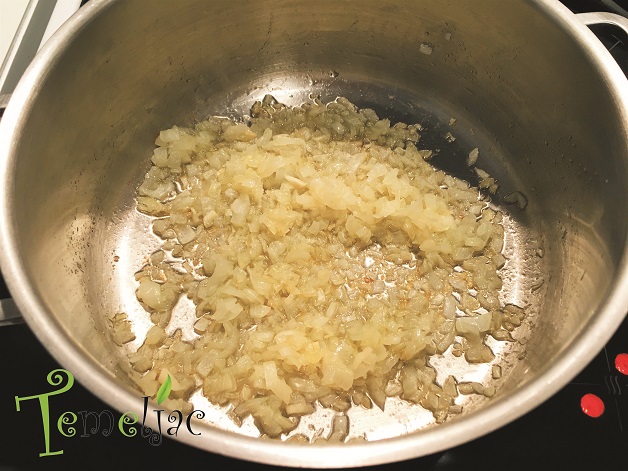 Nasjeckajte luk na sitne komadiće i dinstajte ga na laganoj vatri na maslinovom ulju dok ne postane staklast i lagano požuti.