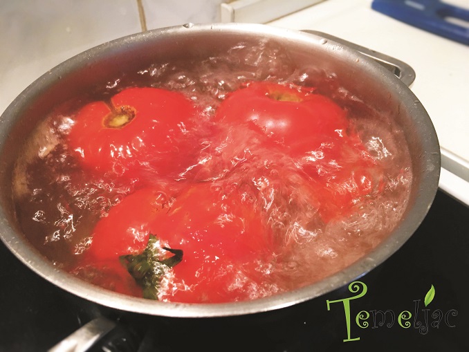 Za paradajz juhu od rajčica obično se koriste rajčice koje su već prilično dozrele i koje nisu više najidealniji izbor za konzumaciju u svježem stanju. Međutim, te rajčice su pune soka, slatke i odličan su izbor za napraviti juhu. Prvo ih je potrebno blanširati. Možete zarezati križić kako bi bile lakše za guljenje. Dakle, blanširajte rajčice, ohladite ih i ogulite. Izrežite ih na sitne kockice ili propasirajte, prema želji. Ja više volim rustikalnu teksturu, pa ih na dasci dobro isjeckam, ali tako da ipak ostanu komadići.