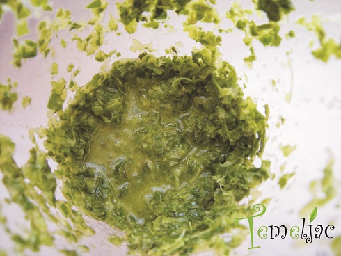 Ostatak povrća sameljite kratko štapnim mikserom uz dodavanje maslinova ulja tako da dobijete grubu pastu. Na tavici prepecite krušne mrvice na maslacu. Izvadite krupir iz pećnice, na njega stavite pastu i povrće, te sve zalijte krušnim mrvicama. Vratite u pećnicu da se zapeče u narednih desetak minuta.
