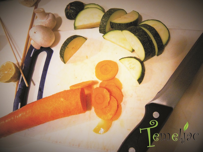 Piletinu izrežite na kocke 3×3 cm ili na trake 2×4 cm, namažite limunovim sokom i ostavite da odstoji par minuta. Limun daje nježan pikantni okus piletini. Za to vrijeme stavite kuhati rižu. Izrežite povrće kako bi dobili komade debljine 1-2 cm i veličine cca 3×3 cm. Posolite piletinu netom prije pečenja i slažite povrće i meso naizmjence na štapić redoslijedom koji vam se sviđa.